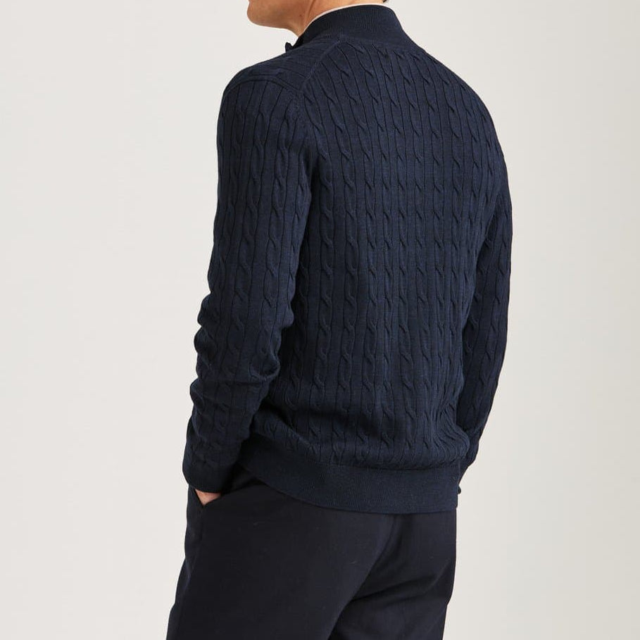 Navy merinoullströja från Morris i cabelmönster.